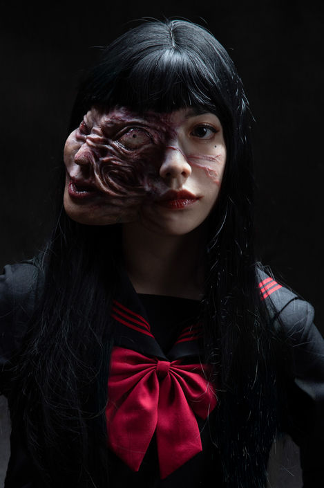 這組作品是我和特化師Una共同完成的,致敬了伊藤潤二筆下的經典 角色「富江」。透過特殊化妝的細膩處理,我們希望能捕捉到「富江」那種神秘、詭異且迷人的氛圍。Una在造型上投入大量心力,不僅在細節上展現出獨特的怪誕感,還融入了些許陰鬱的美學。整體呈現上,我透過光影來強調角色的陰鬱與神秘,創造出一種既真實又超現實的視覺衝擊。